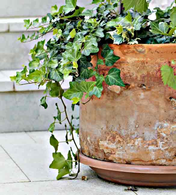 Dusty miller with its silvery foliage pairs beautifully with white violas and trailing ivy.