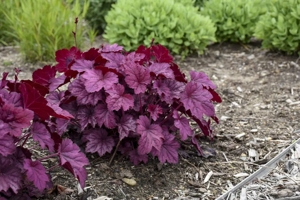- Heuchera (coral bells) a perennial with bold foliage colors from lime green to burgundy.