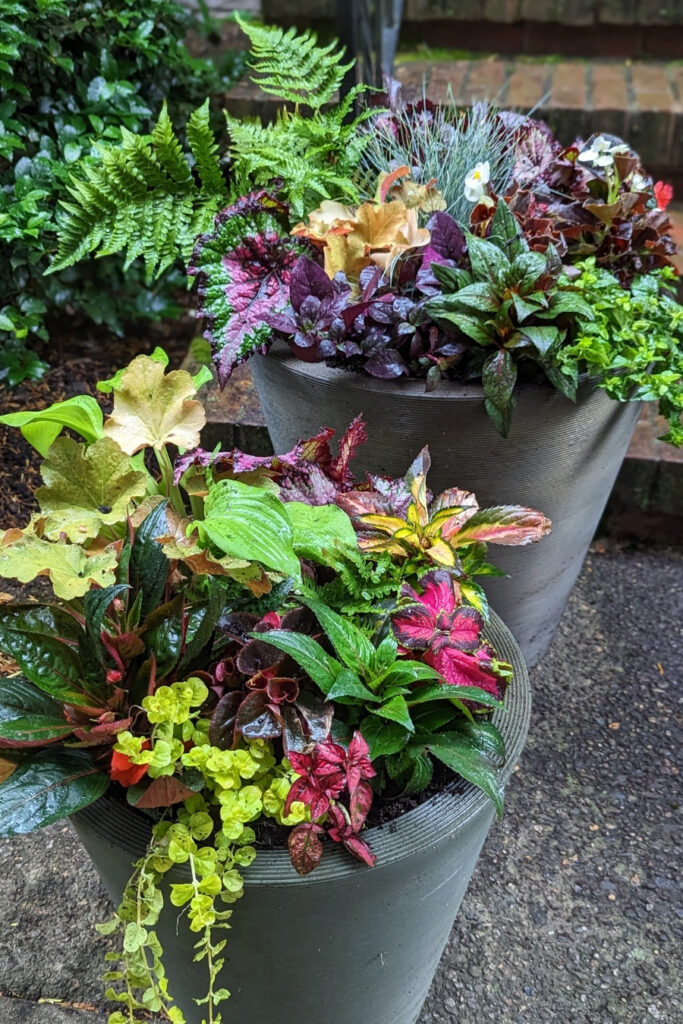 What I noticed again and again were the layers. One home had a tall spiky grass shooting up in the center of a pot, surrounded by pink geraniums and trailing sweet potato vine.