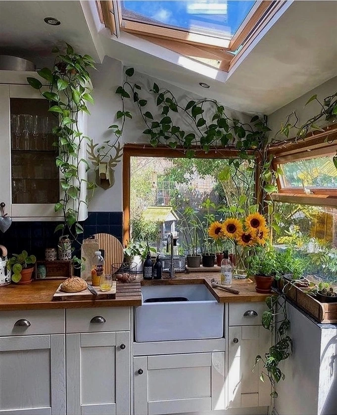 They love the light, and from the outside it makes the house look warm and lived in. Even a little ledge or narrow shelf across a kitchen window can be a good spot for herbs or tiny pots.