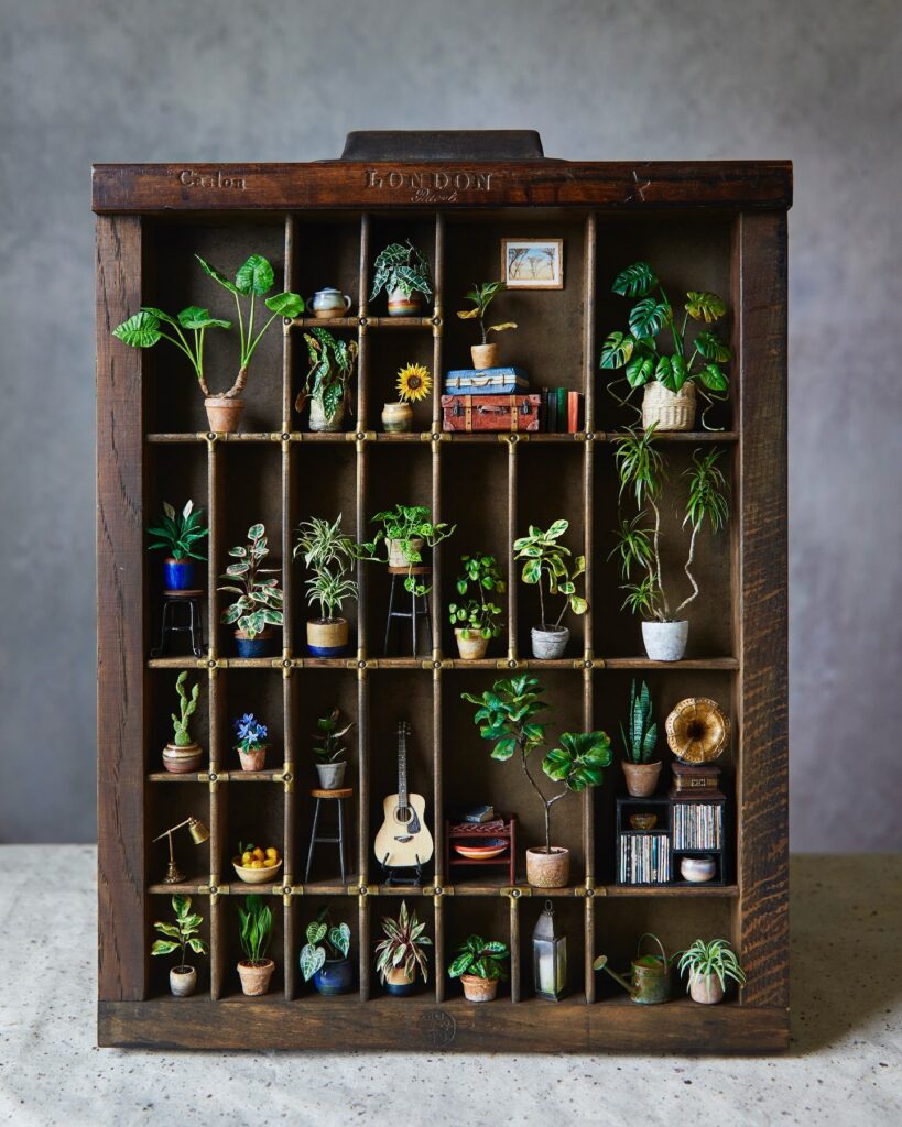 When you run out of horizontal space, go up. A wall-mounted grid or set of small floating shelves can become a living wall.