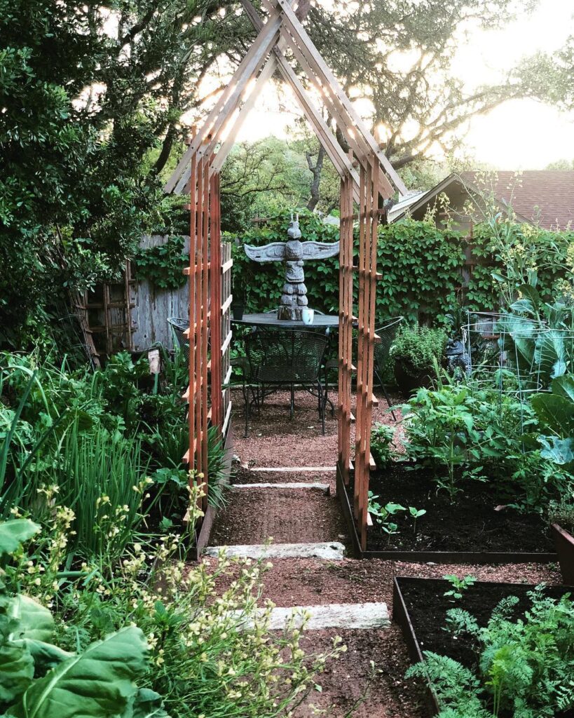 This ones a garden centerpiece. The wooden triangular arch structure feels like a sacred passageway into your veggie kingdom. Cucumbers, beans, or flowers would all be right at home here.