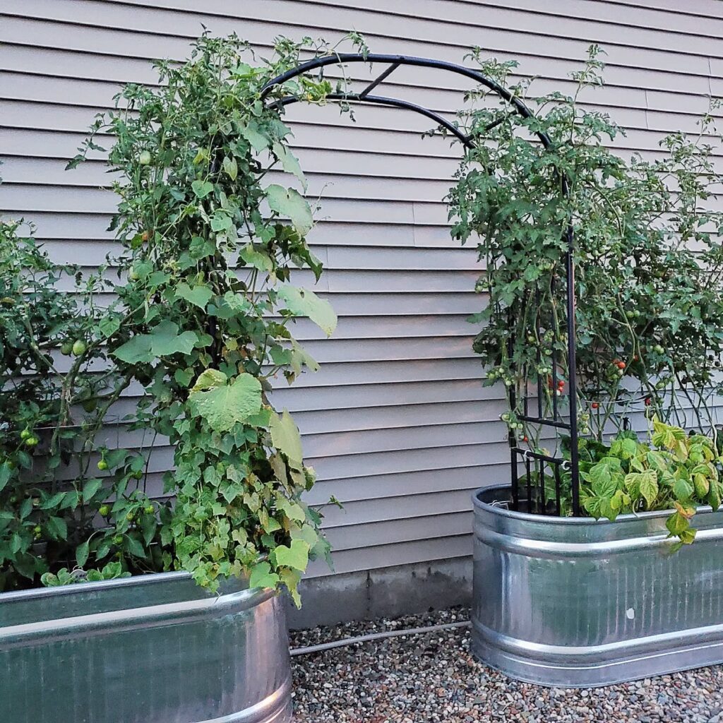 Urban garden vibes at their best. This setup uses metal planter tubs and a sleek arched frame, letting cucumbers and tomatoes mingle in style without eating up yard space.