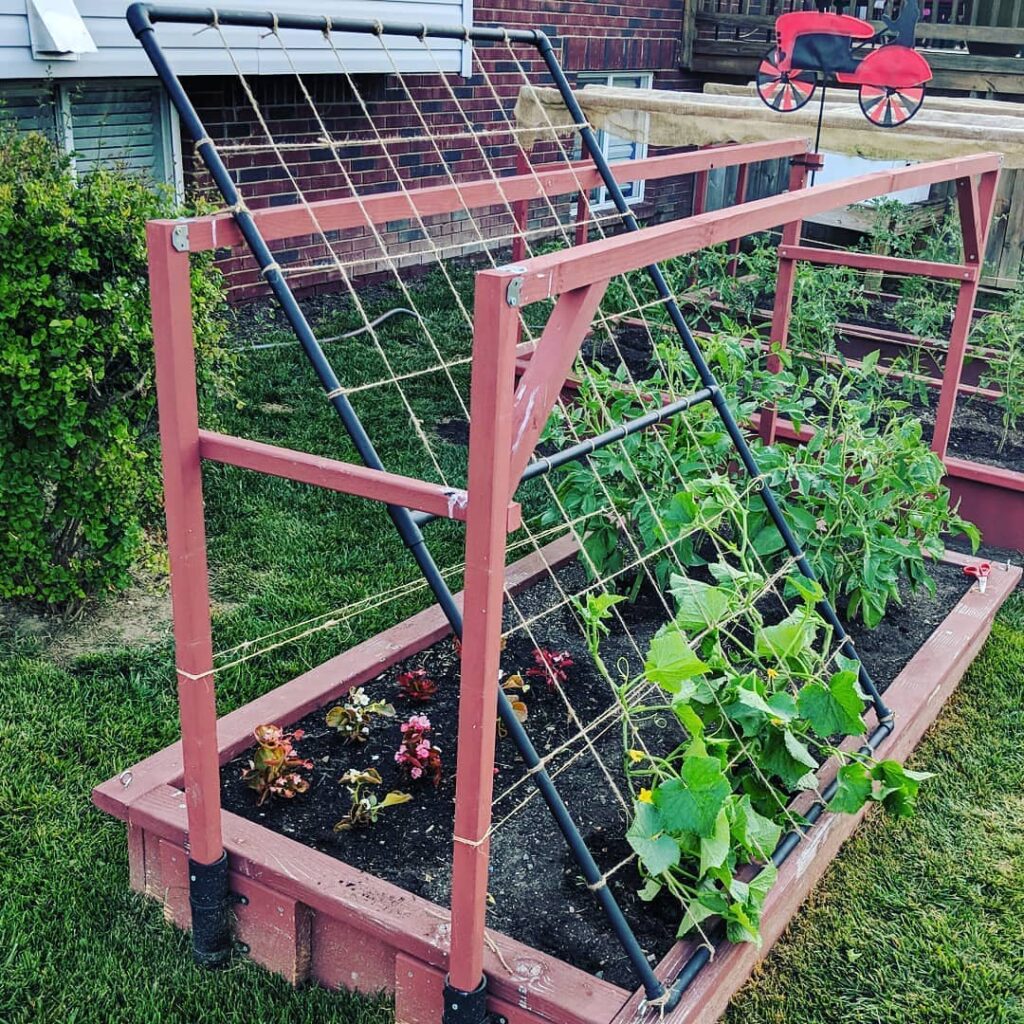 A slanted string-and-frame trellis with serious support. The combo of PVC pipe and wood gives it a modern-industrial edge, and its super functional for raised beds.