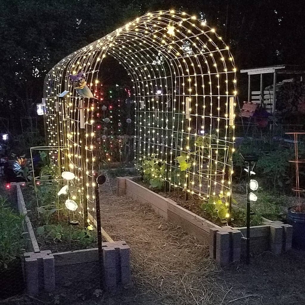 If your cucumbers could choose their dream home, this would be it. A cattle panel arch transformed into an evening wonderland with string lights. Beautiful, practical, and just plain magical.