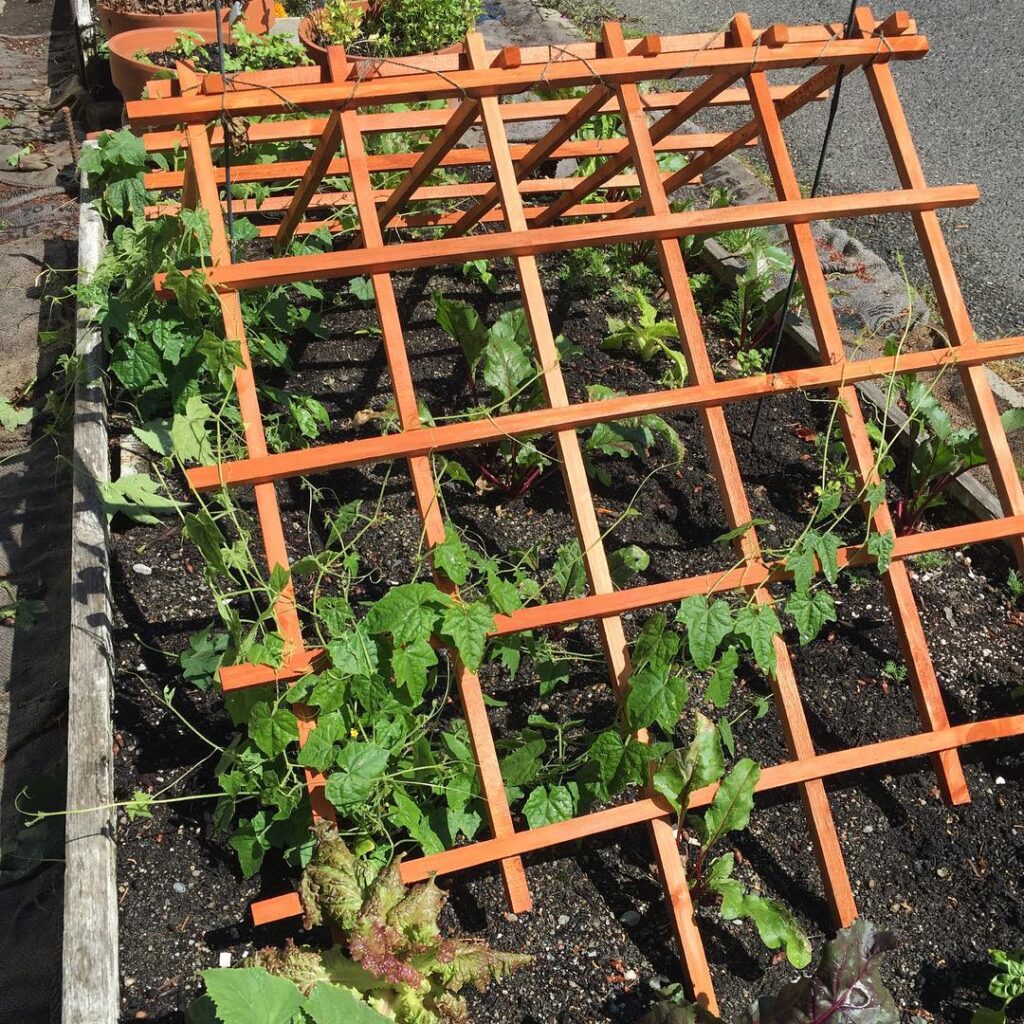 Once its up, I plant my cucumber seedlings about 6 inches away from the base of the trellis.