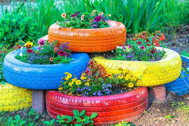 Painted tyres stacked creatively as planters. Quirky, budget-friendly, and fun with kids.