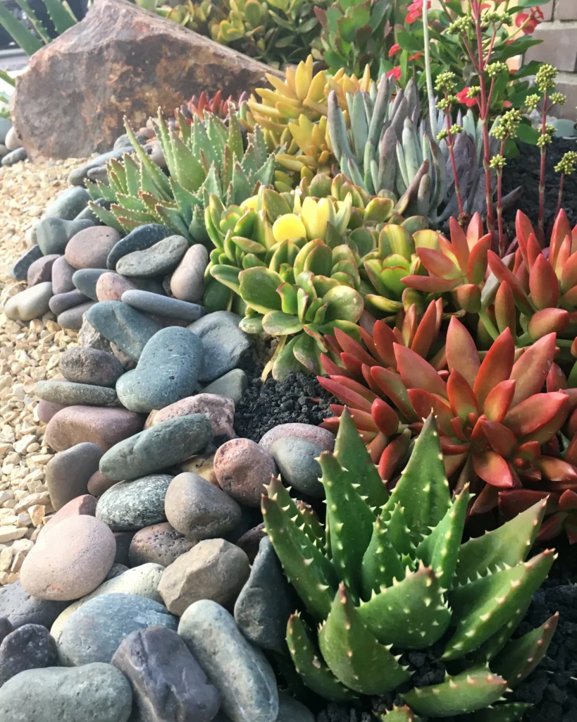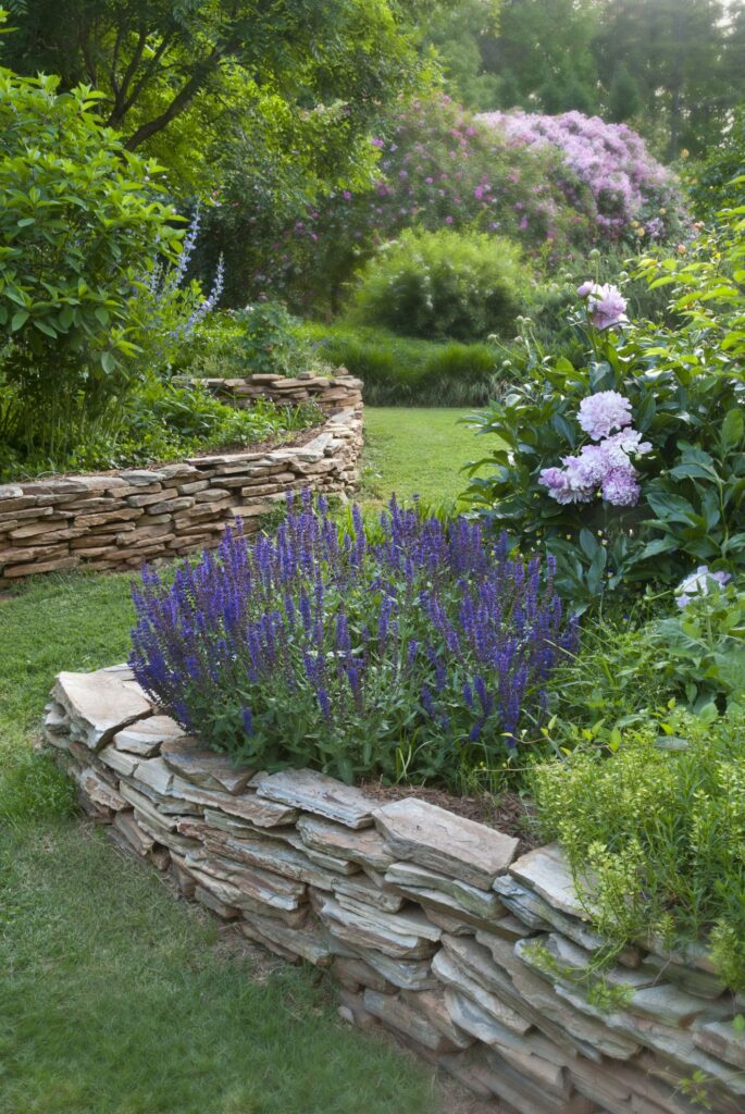 Combine flowers with boulders or large stones for a low-maintenance, sculptural bed.