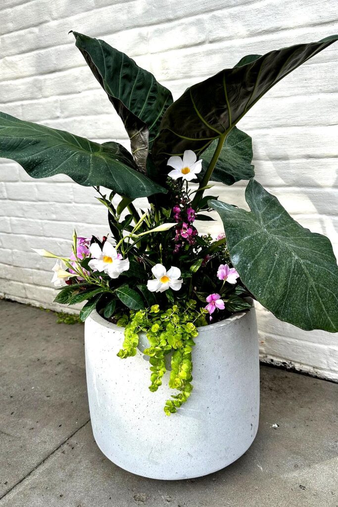 A bold yet soft combo of large tropical leaves and delicate flowers in a clean white concrete pot. Perfect for modern poolside charm or patio style.