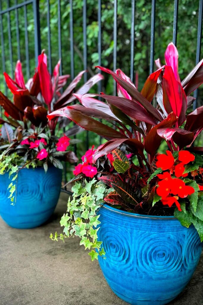 Striking blue pots filled with red tropical foliage and bright blooms create a show-stopping contrastideal for energizing any poolside or patio.
