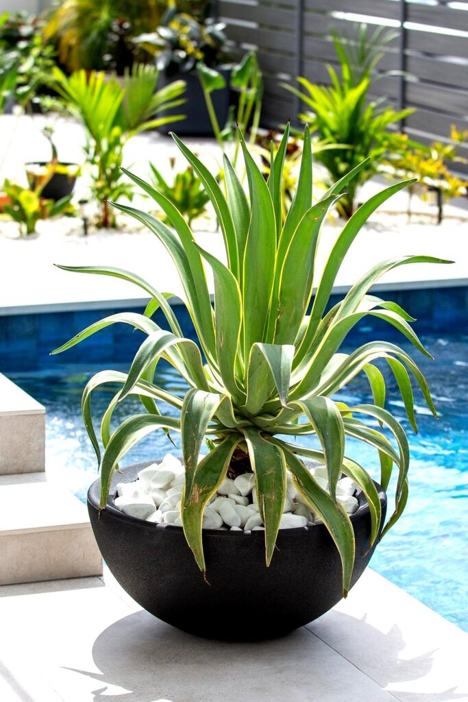Sleek black planter with sculptural agave and white stones creates a bold minimalist look for contemporary poolscapes.
