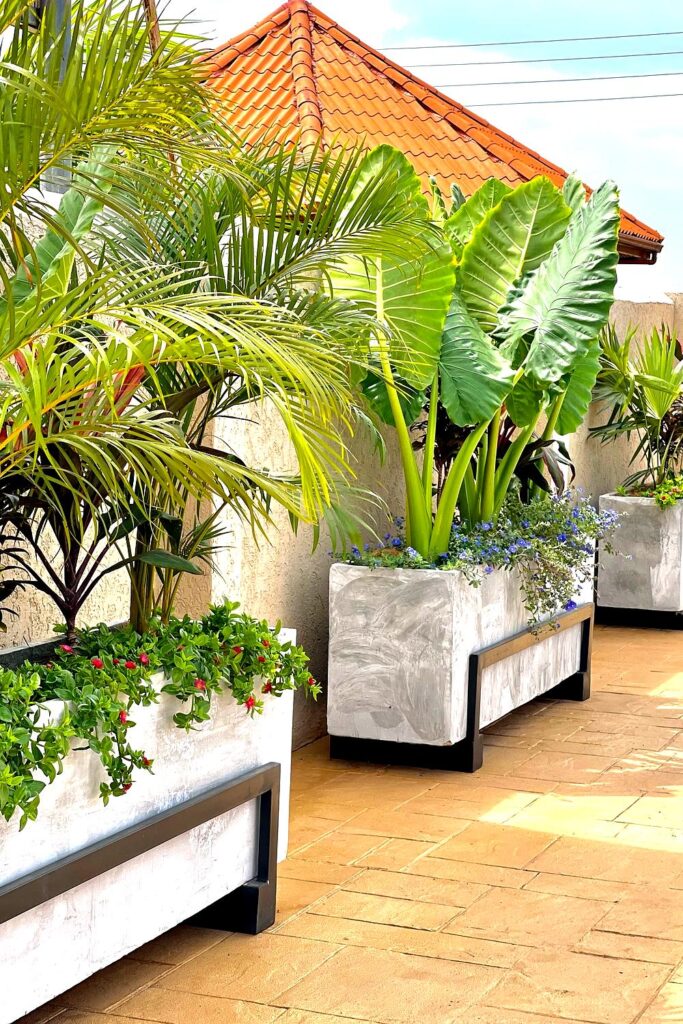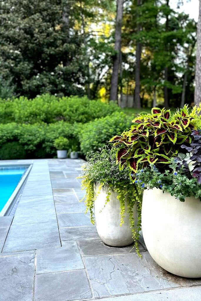 Elevate your pool area with lush tropical planters in sleek concrete pots. Palms, elephant ears, and trailing vines create a resort-style vibe. Perfect for planters around pool ideas and modern backyard decor.