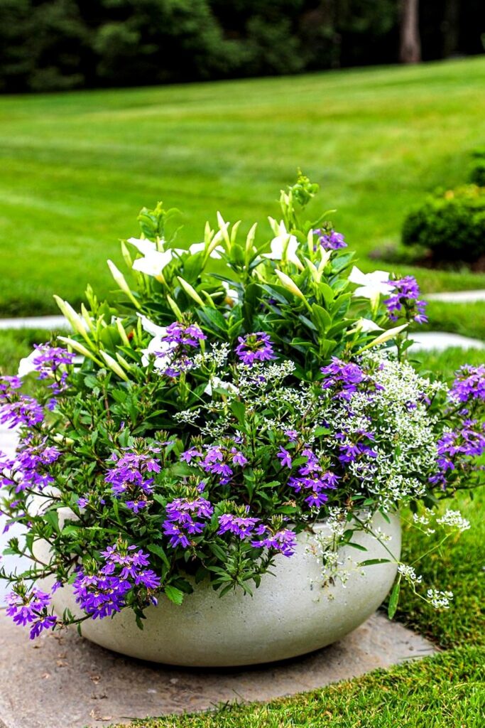 A dreamy blend of delicate white flowers and vibrant purple blooms in a rounded stone planterperfect for softening poolside edges or patio corners.