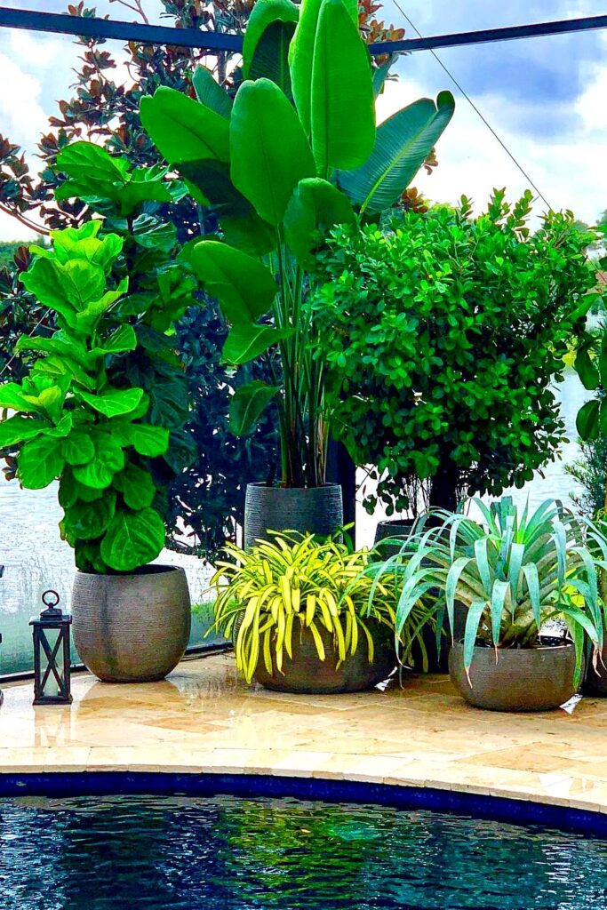 A mix of tropical plants in modern neutral pots creates a layered, resort-style oasis. Ideal for screening, styling, and surrounding your pool in greenery.