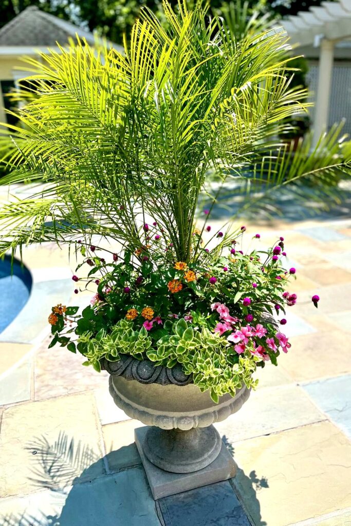 This vibrant urn planter with palms, trailing greenery, and colorful flowers adds instant charm and height around your pool area. A lush tropical touch with classic elegance.