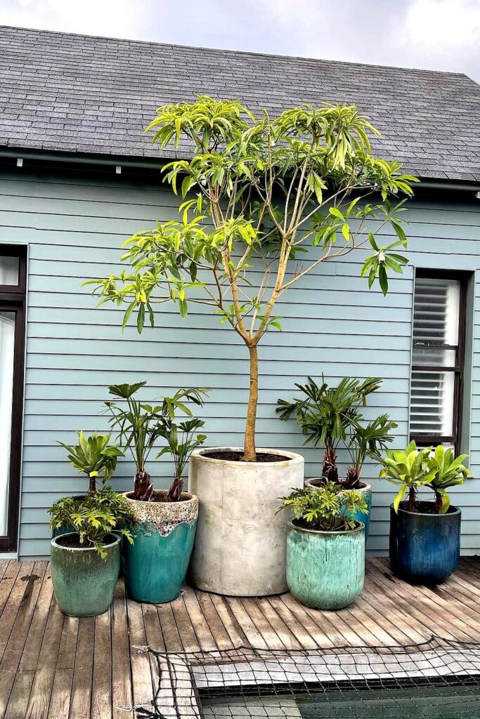 This gorgeous mix of glazed coastal pots and a towering concrete planter adds texture, height, and soft colour to any poolside nookperfect for beachy or tropical backyards.