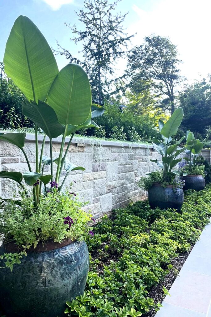 Oversized ceramic planters with bold banana leaves and trailing flowers line the pool wall, creating a lush and structured tropical vibe. Perfect for a chic, modern garden look.