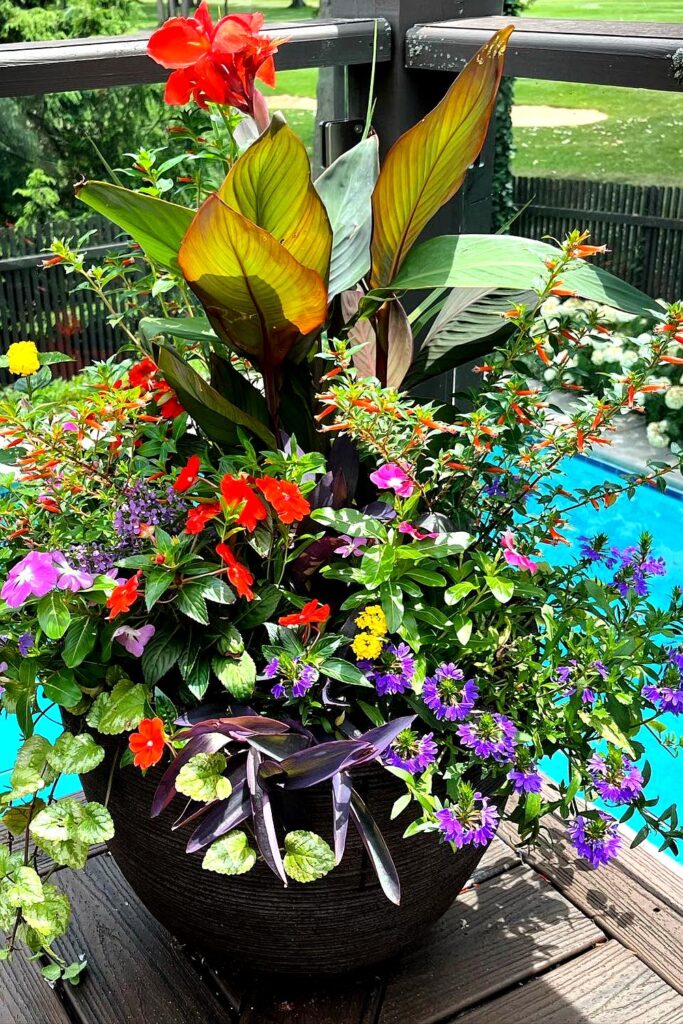 Overflowing with colour, this tropical planter bursts with red, purple, yellow, and orange bloomsbringing high-impact energy to any poolside setting.