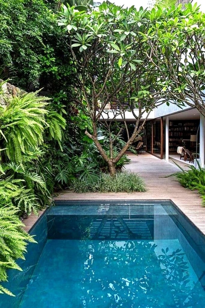 Surround your plunge pool with ferns, frangipanis, and layered tropical greenery for a serene, immersive jungle retreat. Perfect for a shaded garden paradise.