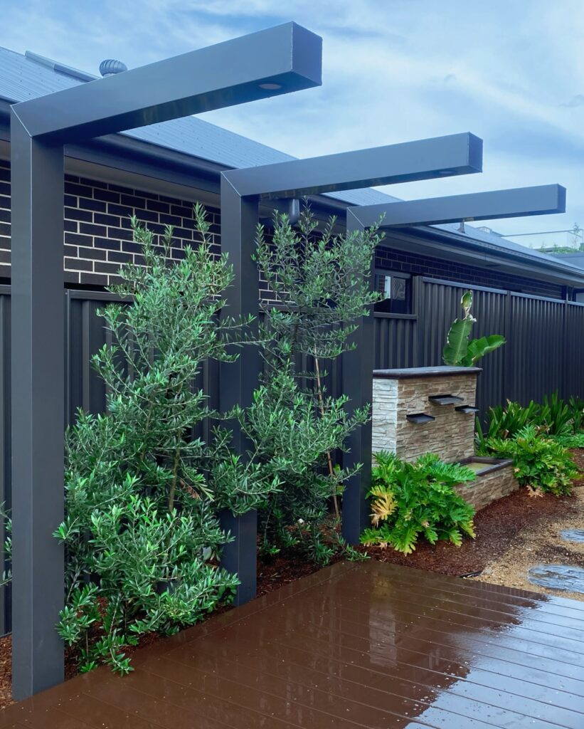 Evergreen shrubs like Westringia or Buxus work great for hedging, and if you want a bit of vertical drama, chuck in a couple of olive trees or some columnar yews.