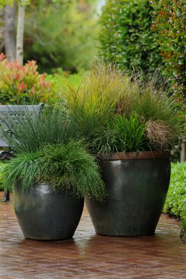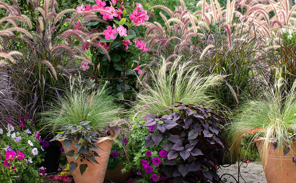 Choose mid-sized containers with good drainage, and use grasses as a vertical anchor in mixed plantings.