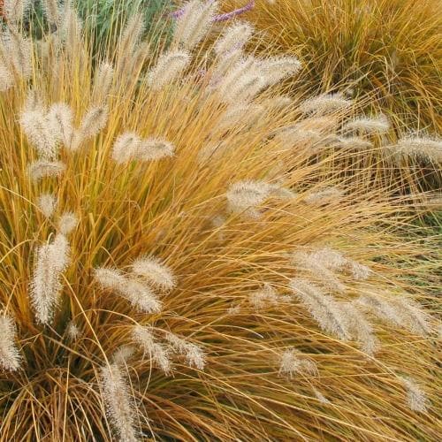 One of the most versatile fall grasses, fountain grass produces bottlebrush-like plumes that glow in afternoon light.