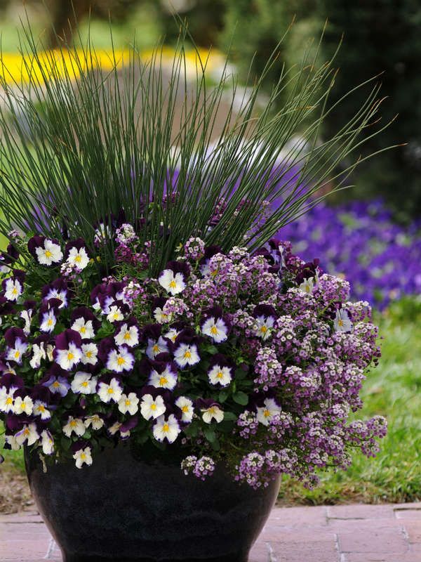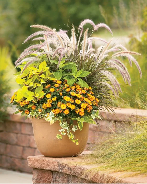 Try surrounding fountain grass with orange and burgundy mums, or let blue fescue sit alongside violas for a striking color contrast.