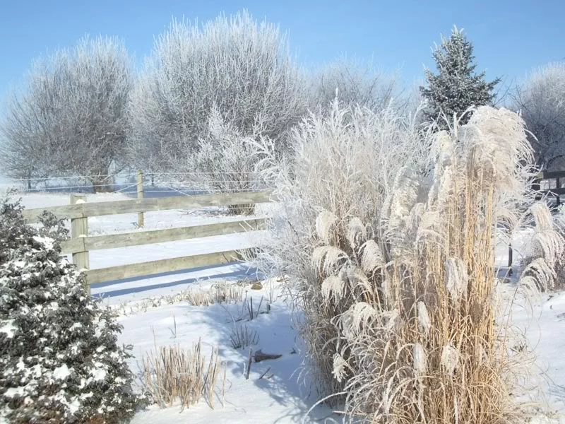Many ornamental grasses keep their form long after the frost. Their dried plumes catch snow or morning frost crystals, turning the garden into a natural sculpture display.