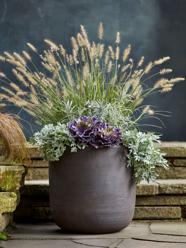 Ornamental kale or pansies at the base of grasses create layers of interest in container displays.