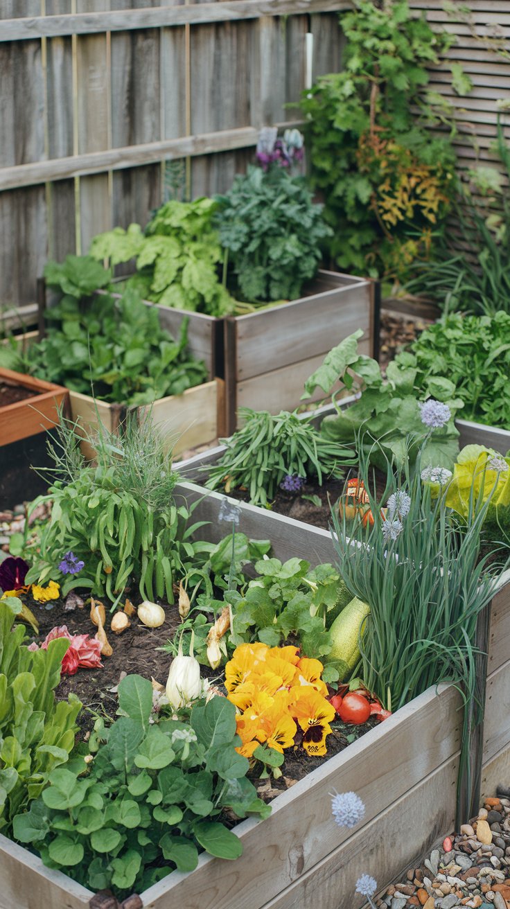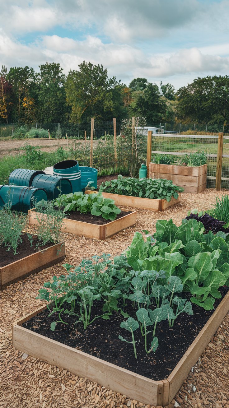 Design a sustainable garden with raised beds, rainwater collection barrels, and thriving vegetable plants. This eco-friendly setup not only provides fresh produce but also reduces your carbon footprint. Incorporate companion planting to optimize space and encourage healthy growth. Recycled materials for garden beds and organic compost enhance the sustainable vibe, proving that urban living and green living can go hand in hand.