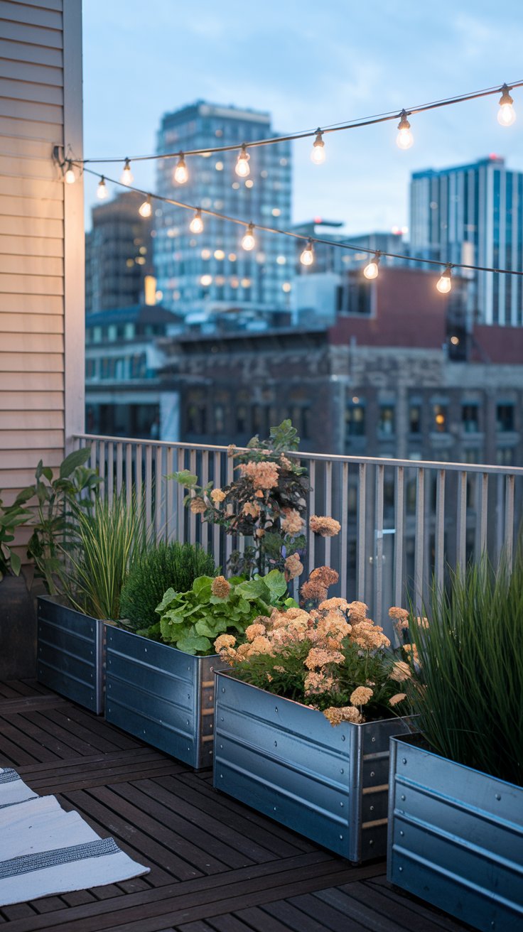 Illuminate your evenings with a modern balcony garden featuring metal planters, string lights, and breathtaking urban views. This setup combines practicality with romance, creating a cozy atmosphere for nighttime relaxation. Use trailing plants and soft lighting to enhance the ambiance, making your balcony a standout feature.