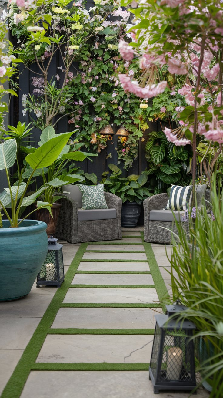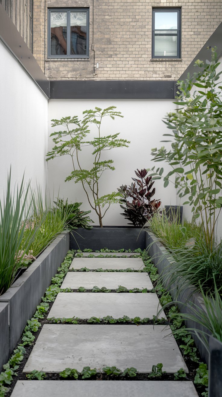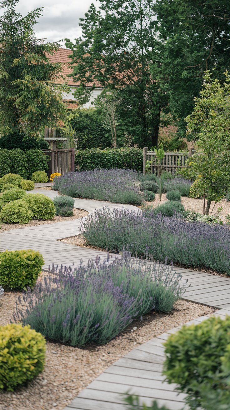 Add charm to your urban garden with winding wooden pathways framed by lavender bushes and small shrubs. The soft scent of lavender creates a calming atmosphere, while the pathways guide you through your serene space. Use natural wood for the paths and pair with low-maintenance plants for a beautiful, effortless garden.