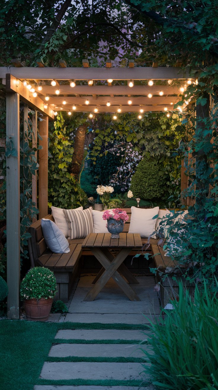 Create a cozy garden corner under a wooden pergola adorned with twinkling string lights. Surrounded by greenery, this setup is perfect for intimate evenings or solo relaxation. Choose climbing plants like jasmine or wisteria to add a touch of romance, and pair them with soft furnishings for comfort. A small table and chairs complete the look, making it ideal for dining al fresco or enjoying a quiet read.