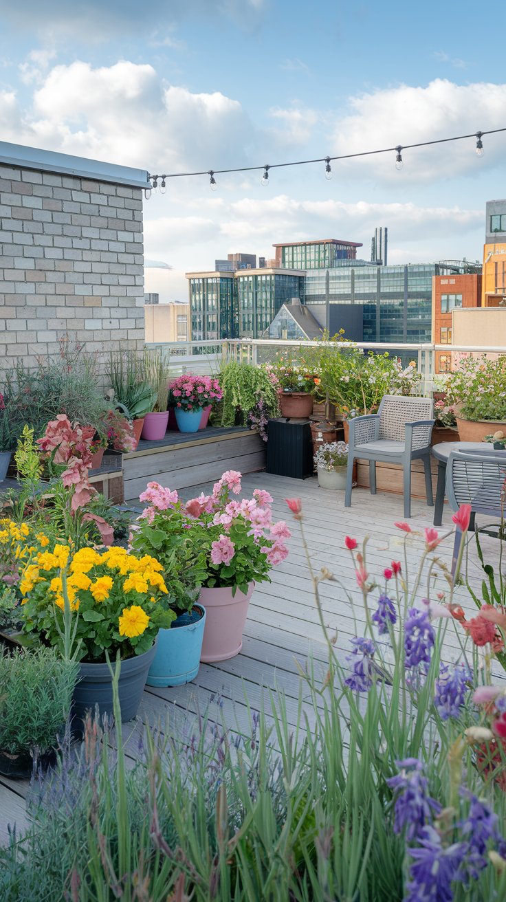 Brighten your rooftop with colorful flowers, potted plants, and a cozy wooden deck. This lively garden is a feast for the senses, blending cheerful blooms with practical seating. Opt for hardy plants like geraniums and marigolds that thrive in sunny spots. A small table and chairs invite leisurely afternoons, while vibrant pots add an extra pop of color.