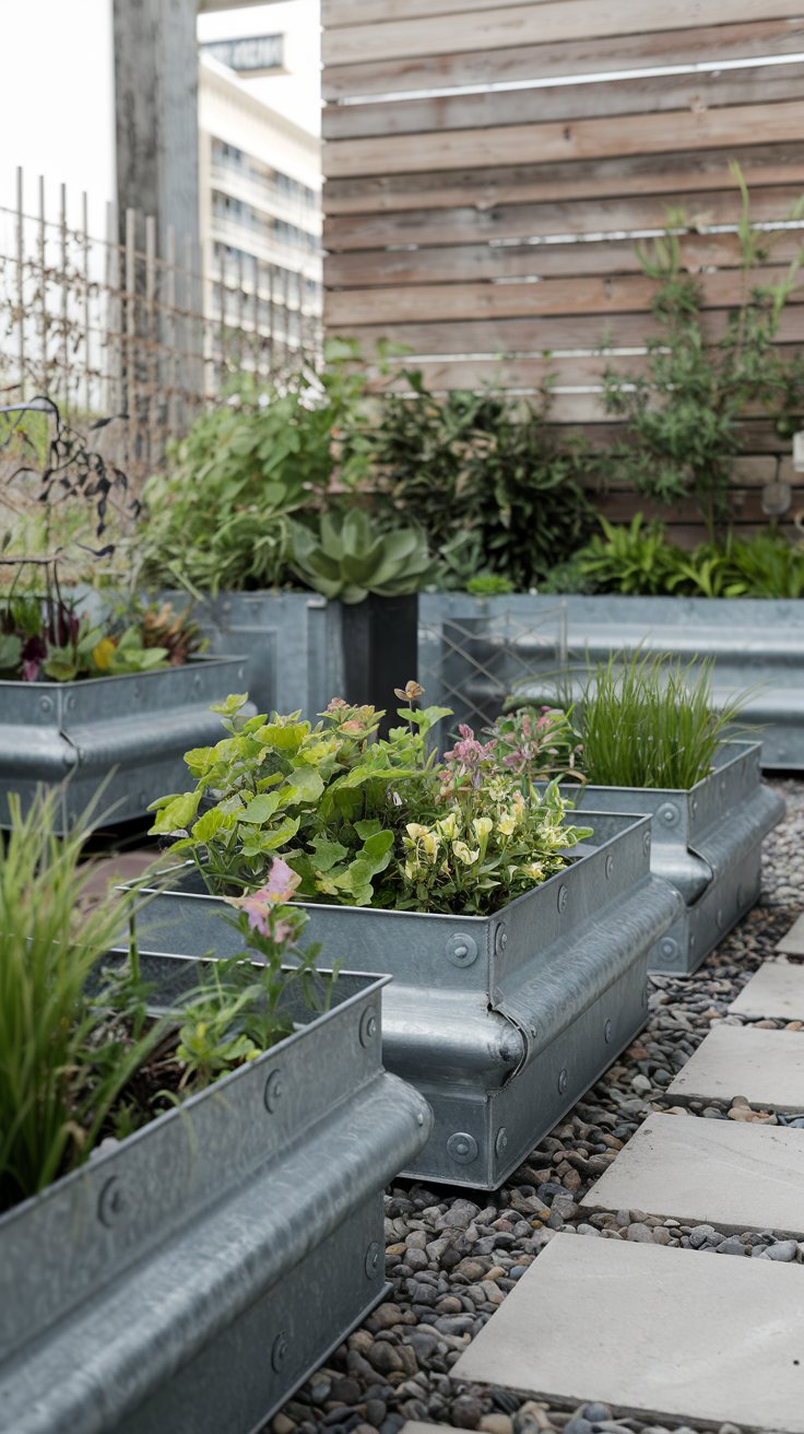 Embrace urban aesthetics with industrial metal planters filled with thriving greenery. The sleek lines and raw materials of this setup create a modern, edgy vibe. Pair metal planters with hardy plants like succulents or ornamental grasses for a striking contrast. This contemporary garden style is perfect for city dwellers seeking a bold yet simple look.