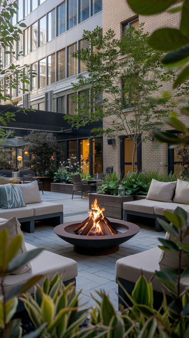 Bring warmth and ambiance to your urban courtyard with a central fire pit, comfortable seating, and leafy plants. This setup is perfect for gathering with friends or relaxing on cooler evenings. Use heat-resistant planters and hardy plants to frame the space, and choose weatherproof seating for durability and style.