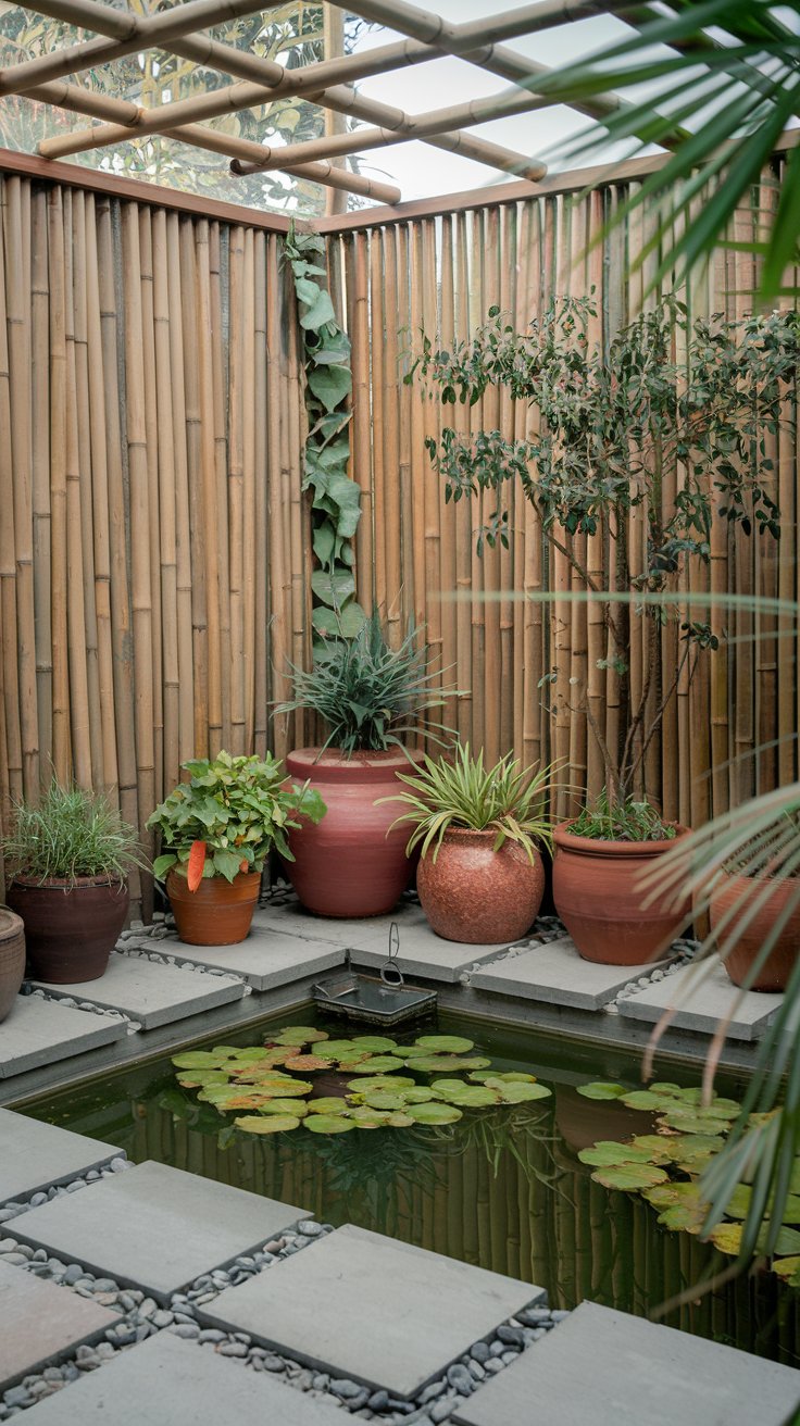 Craft a tranquil retreat with bamboo screens, a small pond, and neatly arranged potted plants. This peaceful garden setup offers a meditative ambiance, perfect for unwinding after a busy day. Bamboo adds privacy and an exotic feel, while a water feature creates soothing sounds. Use simple, elegant planters to complete the aesthetic and let nature s simplicity take center stage.