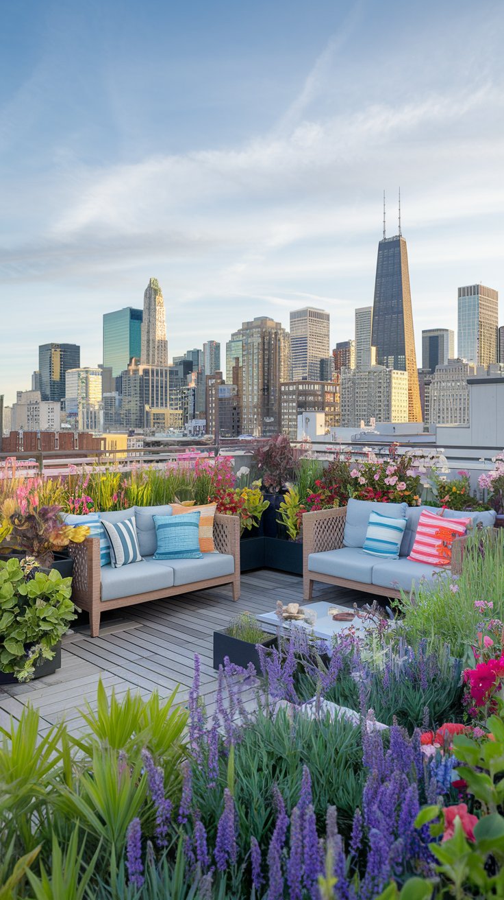 Transform your rooftop into a verdant escape with lush greenery, vibrant flowers, and cozy seating. Picture yourself unwinding against a backdrop of the city skyline, with colorful blooms framing your serene space. A mix of low-maintenance plants like succulents and perennials can thrive in rooftop conditions, while sturdy furniture and soft cushions create a perfect relaxation spot. Add some string lights for an enchanting vibe after sunset, making your rooftop a true urban oasis.