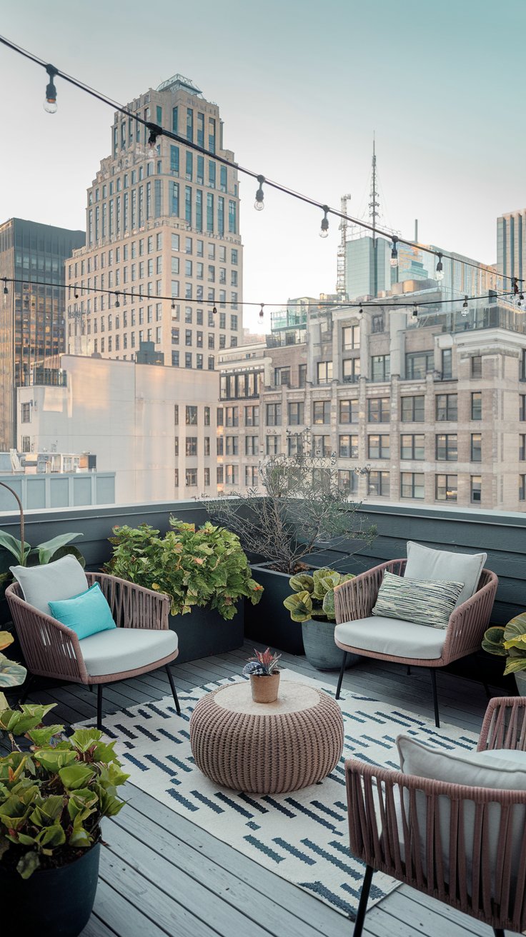 Design a rooftop haven with cozy chairs, potted plants, and a stunning city view. This inviting setup blends comfort and greenery for the perfect escape. Use durable outdoor furniture and weather-resistant plants like lavender or rosemary for a fragrant touch. Enhance the ambiance with soft lighting and enjoy your rooftop retreat any time of day.