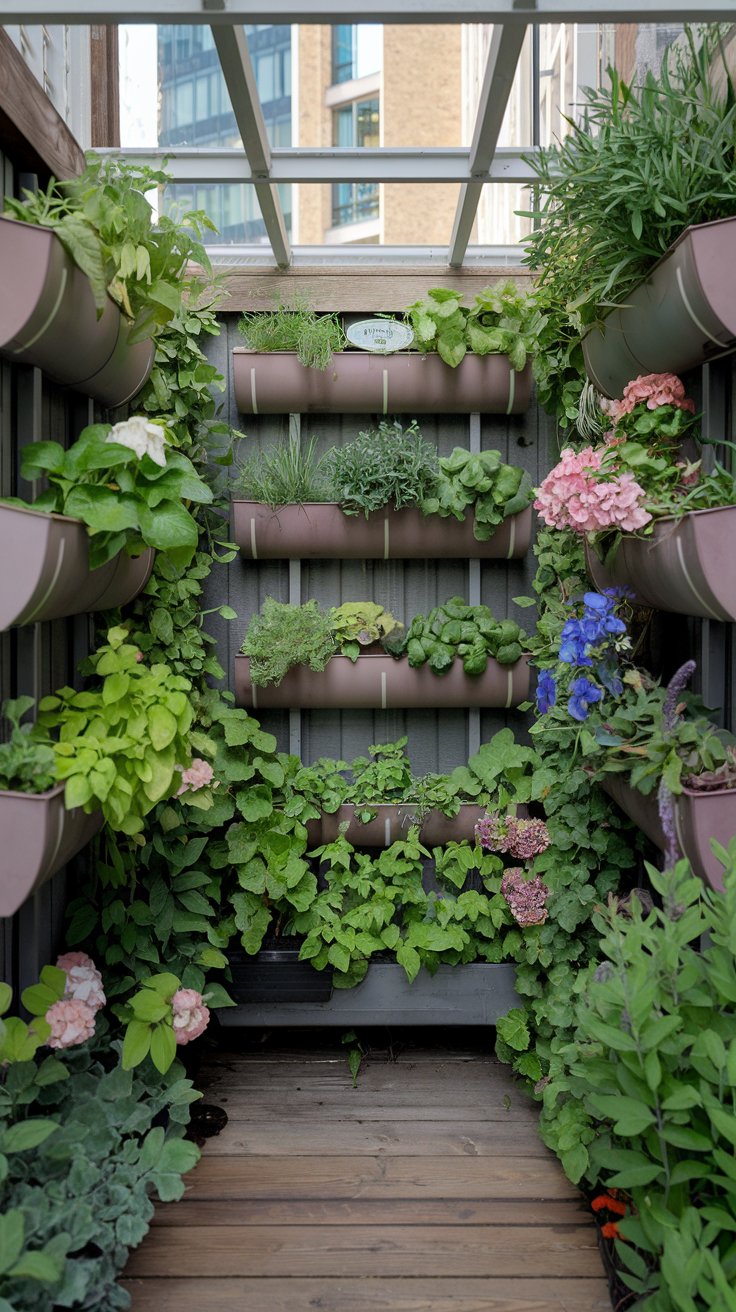 Maximize your urban space with vertical planters filled with aromatic herbs and cascading flowers. Framed by city walls, this compact setup can turn any small corner into a lush paradise. Vertical gardening not only saves space but also creates a stunning visual impact. Opt for fragrant herbs like basil or mint and vibrant flowers such as petunias for a mix of functionality and beauty. Perfect for urban dwellers with limited room to grow.