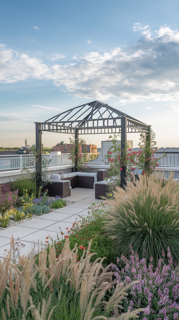 Enhance your rooftop with a stylish gazebo surrounded by flowering plants and ornamental grasses. This setup provides shade and charm, perfect for entertaining or relaxing. Use climbing plants like clematis or honeysuckle to adorn the gazebo and add colorful blooms for extra visual appeal.