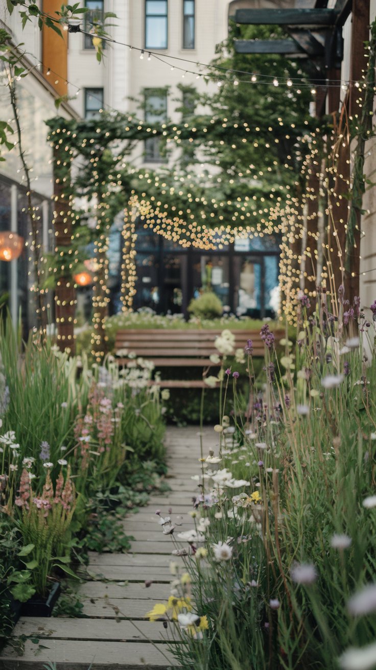 Transform your urban garden into a magical wonderland with fairy lights, wildflowers, and a cozy bench. This dreamy setup offers a whimsical escape from the city. Choose wildflowers like daisies or poppies for a natural look and let the fairy lights create an enchanting glow. A simple wooden bench completes the storybook vibe.