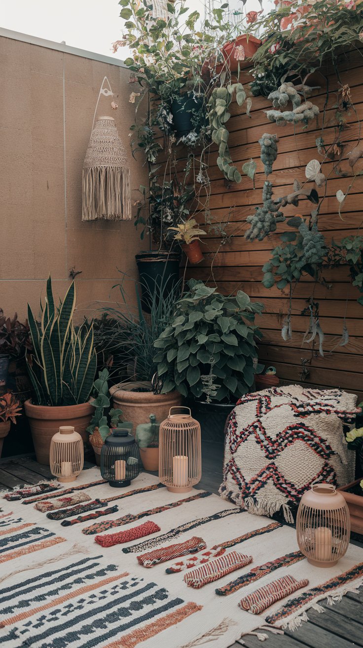 Embrace boho style with textured outdoor rugs, potted plants, and a variety of lanterns. This eclectic garden setup is perfect for creating a laid-back, artistic vibe. Use macramé hangers and mismatched pots for a playful touch, and scatter lanterns for soft, ambient lighting. Add a few throw pillows to create the ultimate boho-inspired retreat.