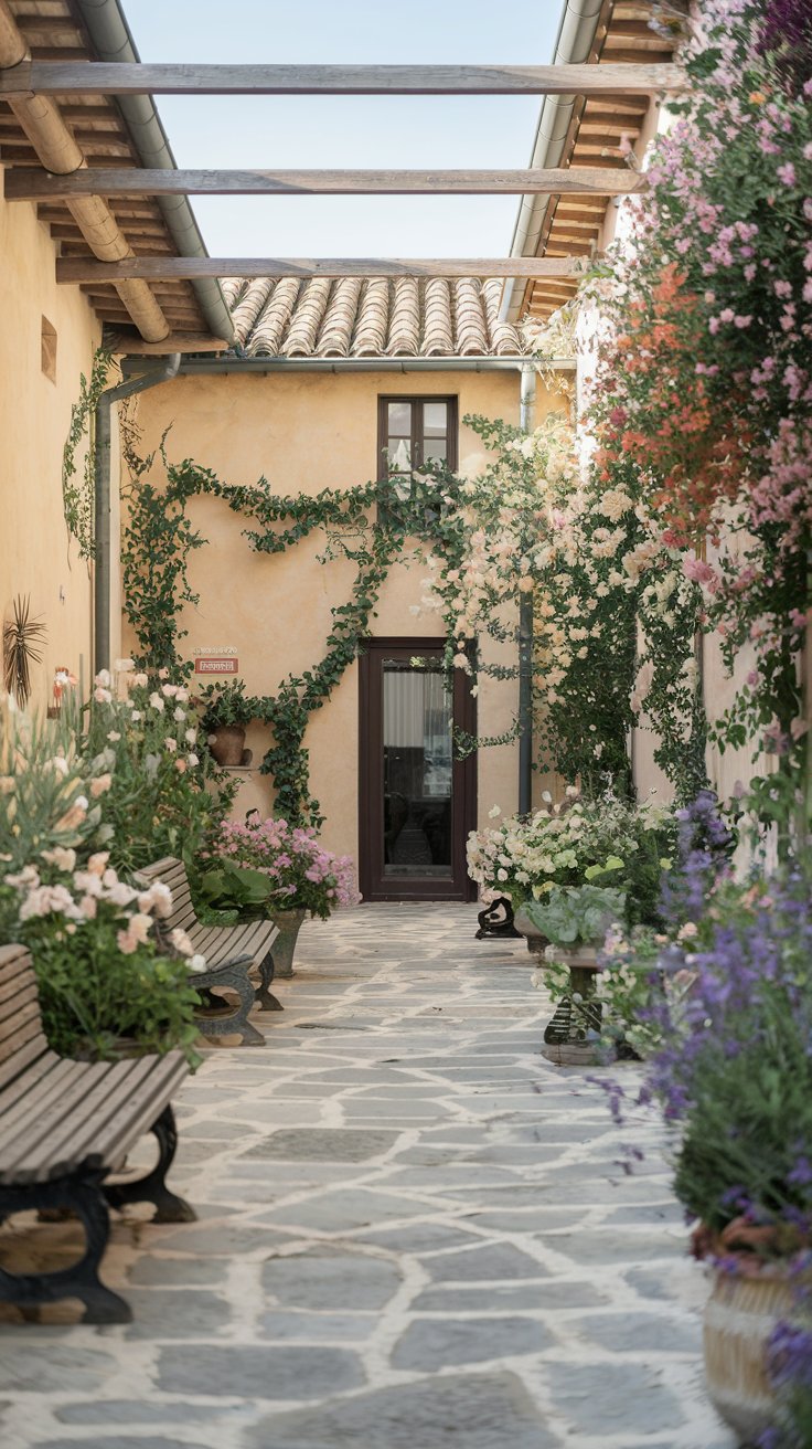 Step into a rustic escape with a courtyard featuring wooden benches, a stone pathway, and a riot of blooming flowers. This setup captures the charm of a countryside garden right in the heart of the city. Use natural materials like reclaimed wood and weathered stone to create a warm, welcoming vibe. Filling the space with colorful flowers like daisies or zinnias adds a lively and cheerful touch.