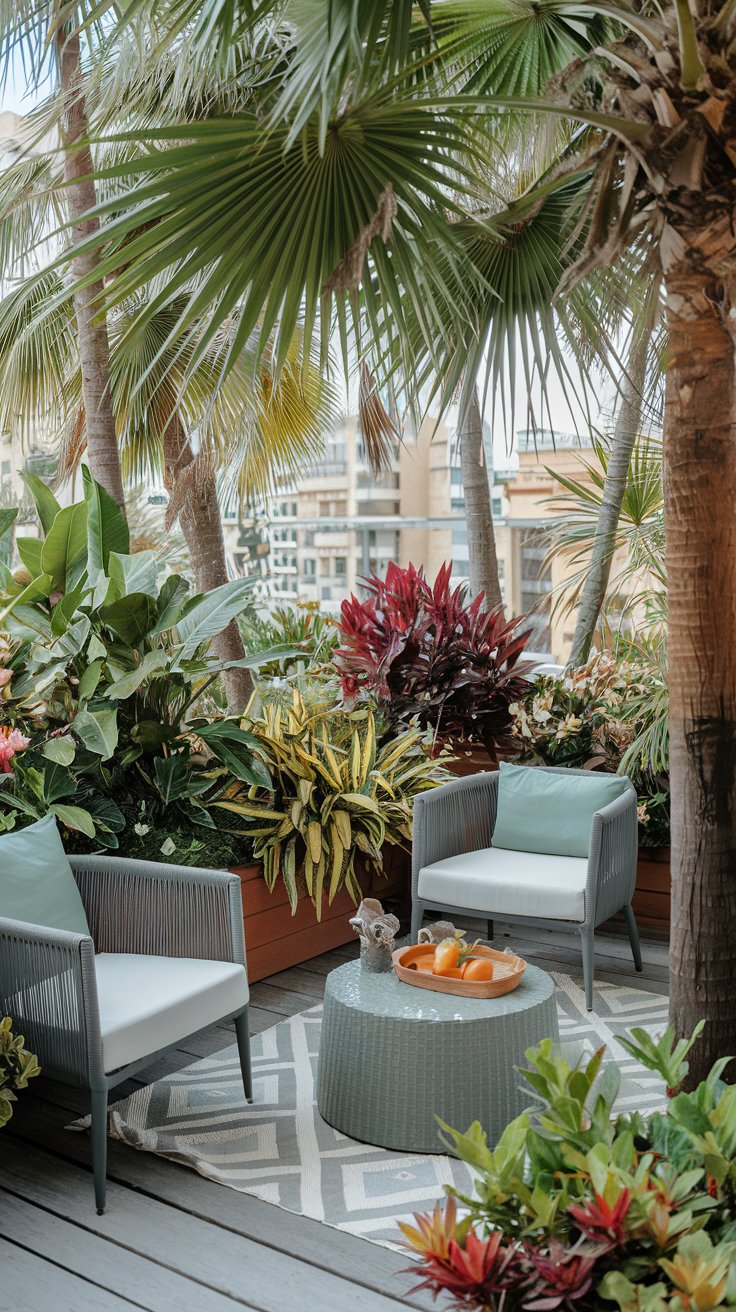 Turn your terrace into a jungle-inspired oasis with palm trees, tropical plants, and cozy outdoor furniture. This lush setup creates a vacation vibe right at home. Use large planters for palms and smaller ones for tropical blooms like hibiscus or bird of paradise. Add comfortable seating and colorful cushions to complete the tropical experience.
