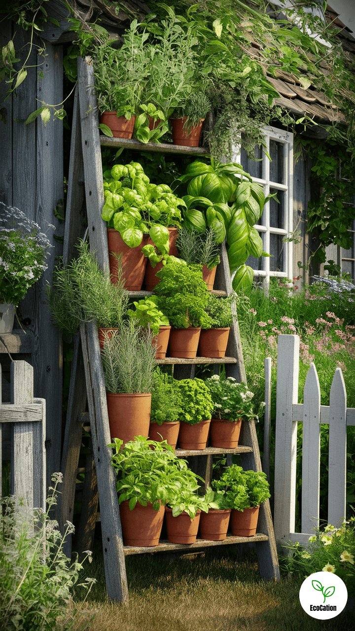 10. Rustic Vertical Herb Garden with Ladder Frame
