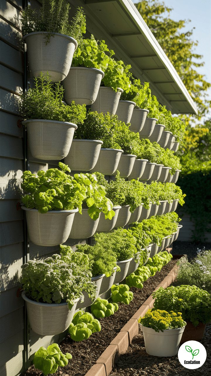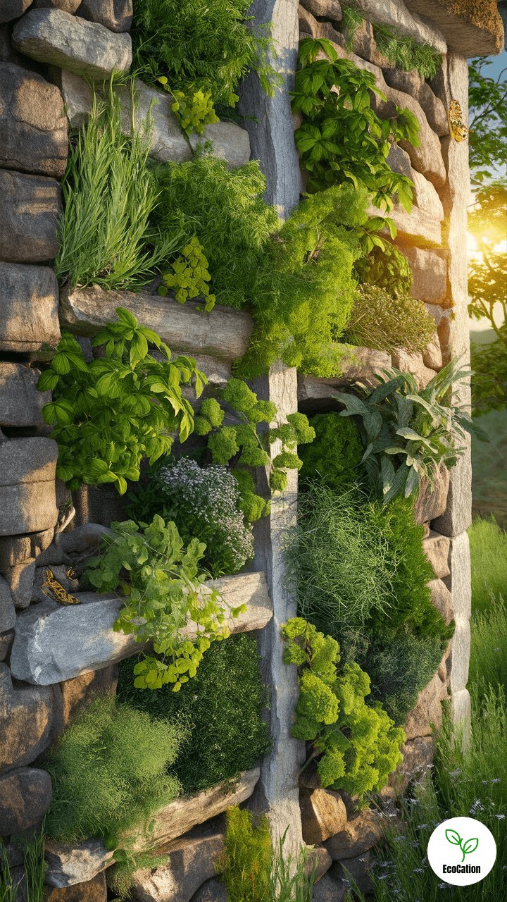 If you have a stone wall in your garden, why not use it as the backdrop for a vertical herb garden? Attach planters directly to the wall, or install shelves to create tiers. The natural stone provides a beautiful contrast to the green herbs and adds a timeless, earthy feel to your garden space. This setup is durable and can withstand various weather conditions.