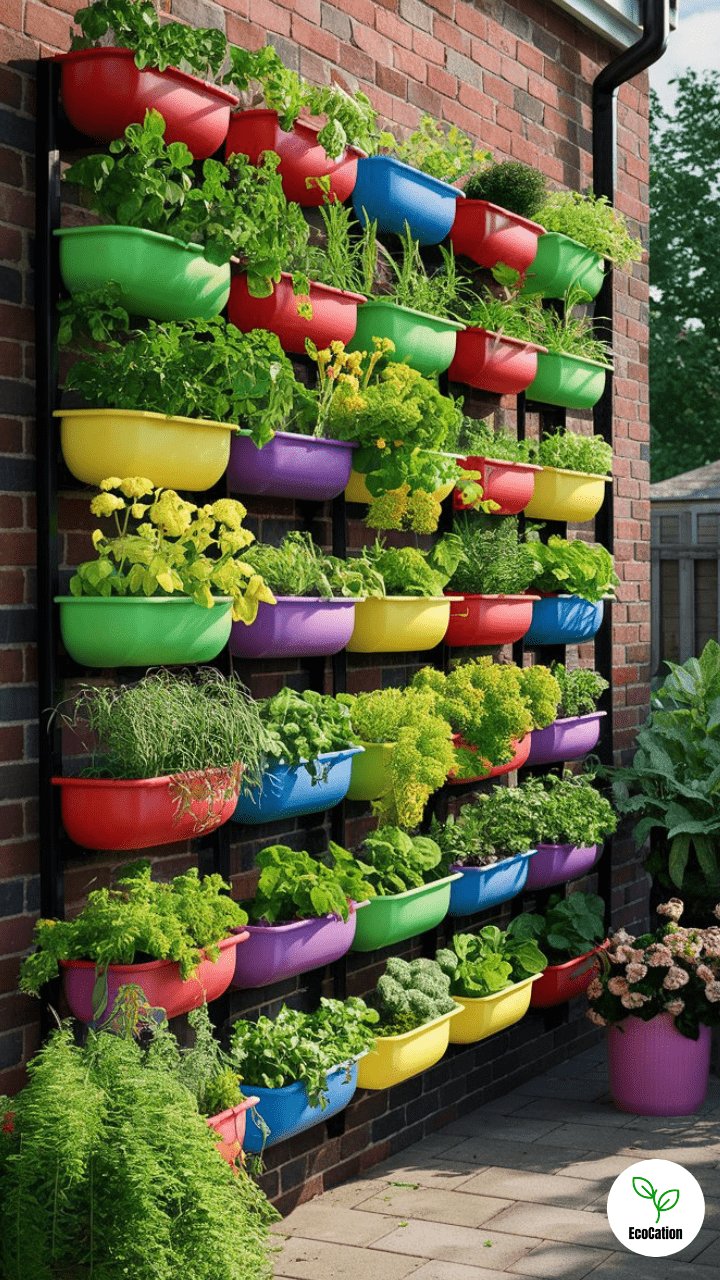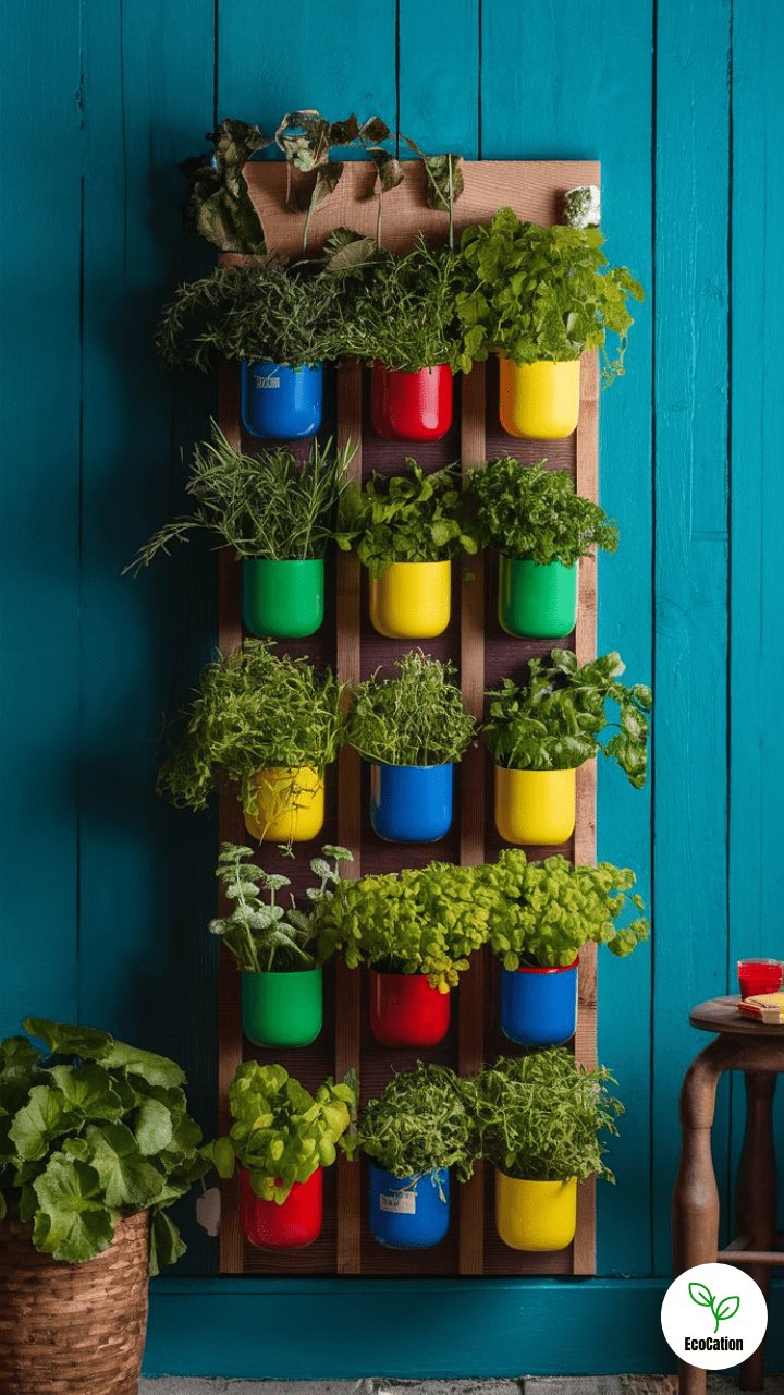 Brighten up your space with a vertical herb garden made from colorful planters. Mount vibrant pots on a wall or fence, or hang them from hooks for a playful, eye-catching display. Choose colors that complement your existing décor, or mix and match for a more eclectic look. The pop of color will make your garden not just functional but a visual delight.