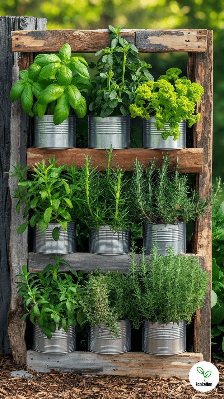 Get eco-friendly by creating a vertical herb garden with recycled materials. Think old pallets, tin cans, or even rain gutters. Not only is this an environmentally conscious choice, but it also adds a unique, personalized touch to your garden. Just make sure to drill holes for drainage and secure the materials well to ensure stability.