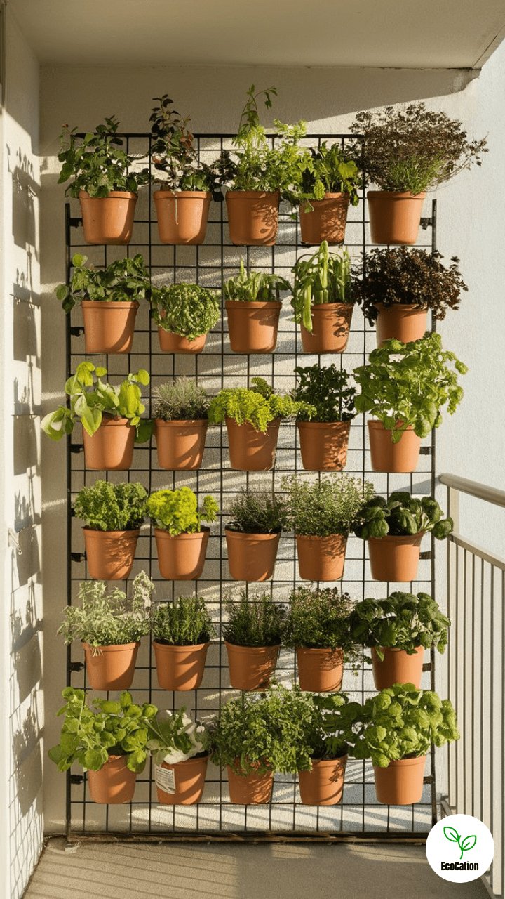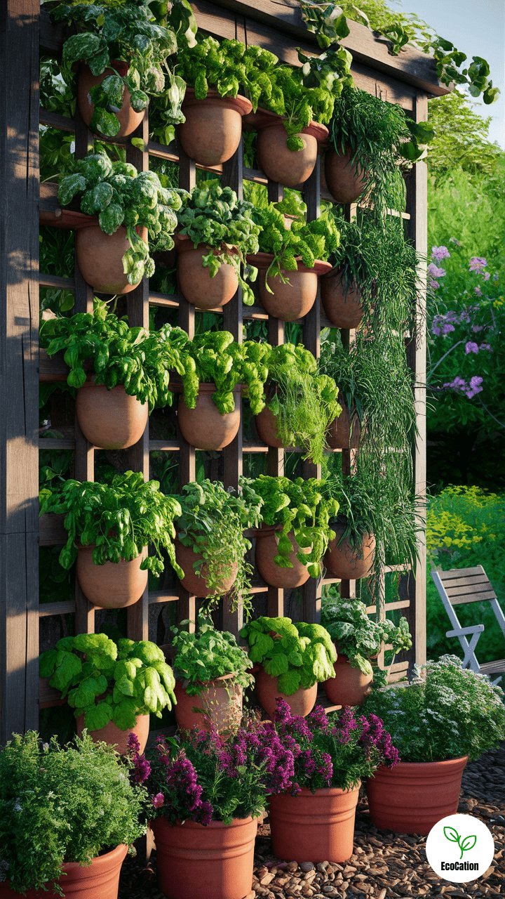 Combine classic clay pots with a trellis to create a structured vertical herb garden. Attach the pots to the trellis using metal hooks or clamps, allowing the plants to grow upward and spread out. This setup is particularly effective for herbs that like to climb or spread, such as mint or oregano. The trellis also adds an elegant touch to your garden.